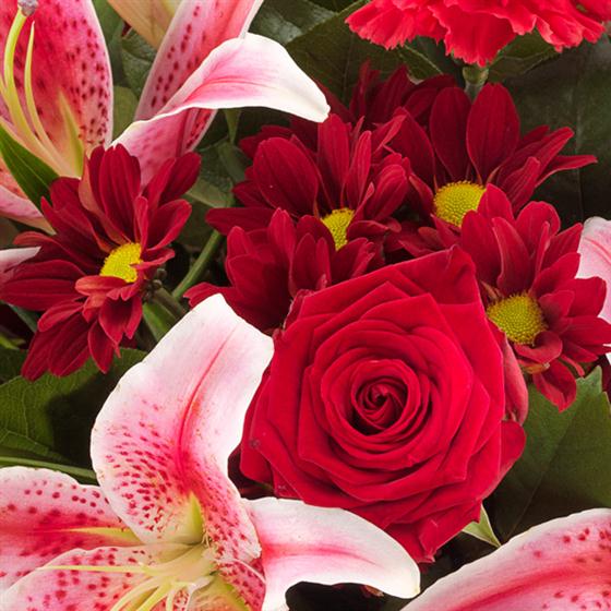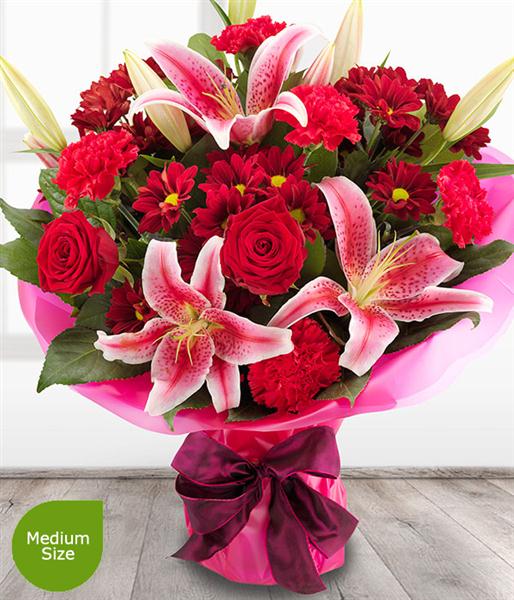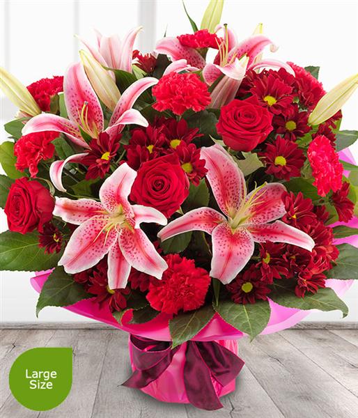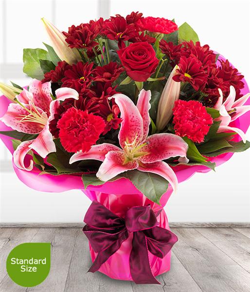 An incredibly romantic and simply stunning red Rose & pink Lily flower bouquet with deep red Spray Chrysanthemums and bold Carnation blooms.