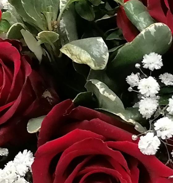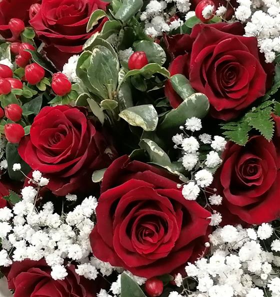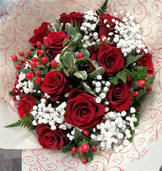 12 beautiful red velvety roses nestled in gypsophila and hypericum berries and foliages.