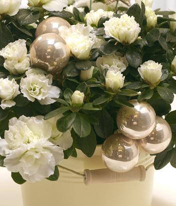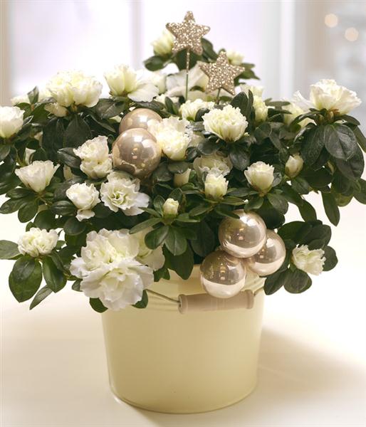 A beautiful Azalea plant decorated with silver coloured accessories. A simple but stunning Christmas flower gift presented in a zinc bucket or ceramic pot.