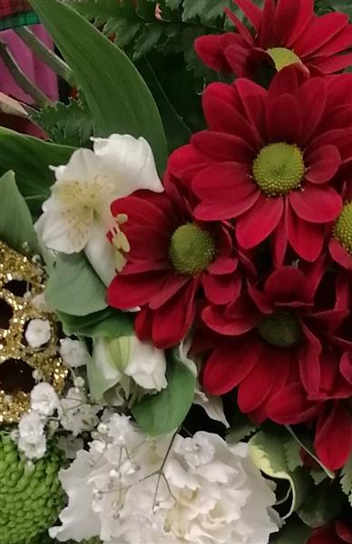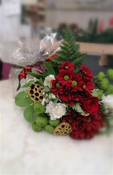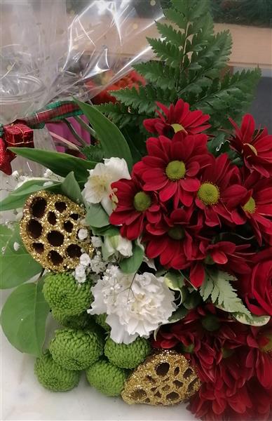 A florist choice bouquet in shades of reds, greens and whites with gold accents comes gift wrapped complete with a vase ready to display. Classic Christmas in a vase. Flowers may vary.